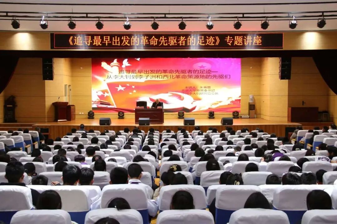 讲座上,朱善璐以“追寻最早出发的革命先驱者的足迹”为核心,深入剖析李大钊、陈独秀等人在建党初期的理论探索与实践贡献。随后,他结合详实史料,聚焦西北革命策源地,生动还原了李子洲、乔国祯等人在陕传播马克思主义、领导农民运动、创建西北党组织的艰辛历程,勾勒出西北革命从萌芽到发展的历史脉络,提炼出革命先驱们“为信仰赴汤蹈火、为人民鞠躬尽瘁”的精神特质,让现场听众在革命历史追溯中坚定信仰、感悟初心。