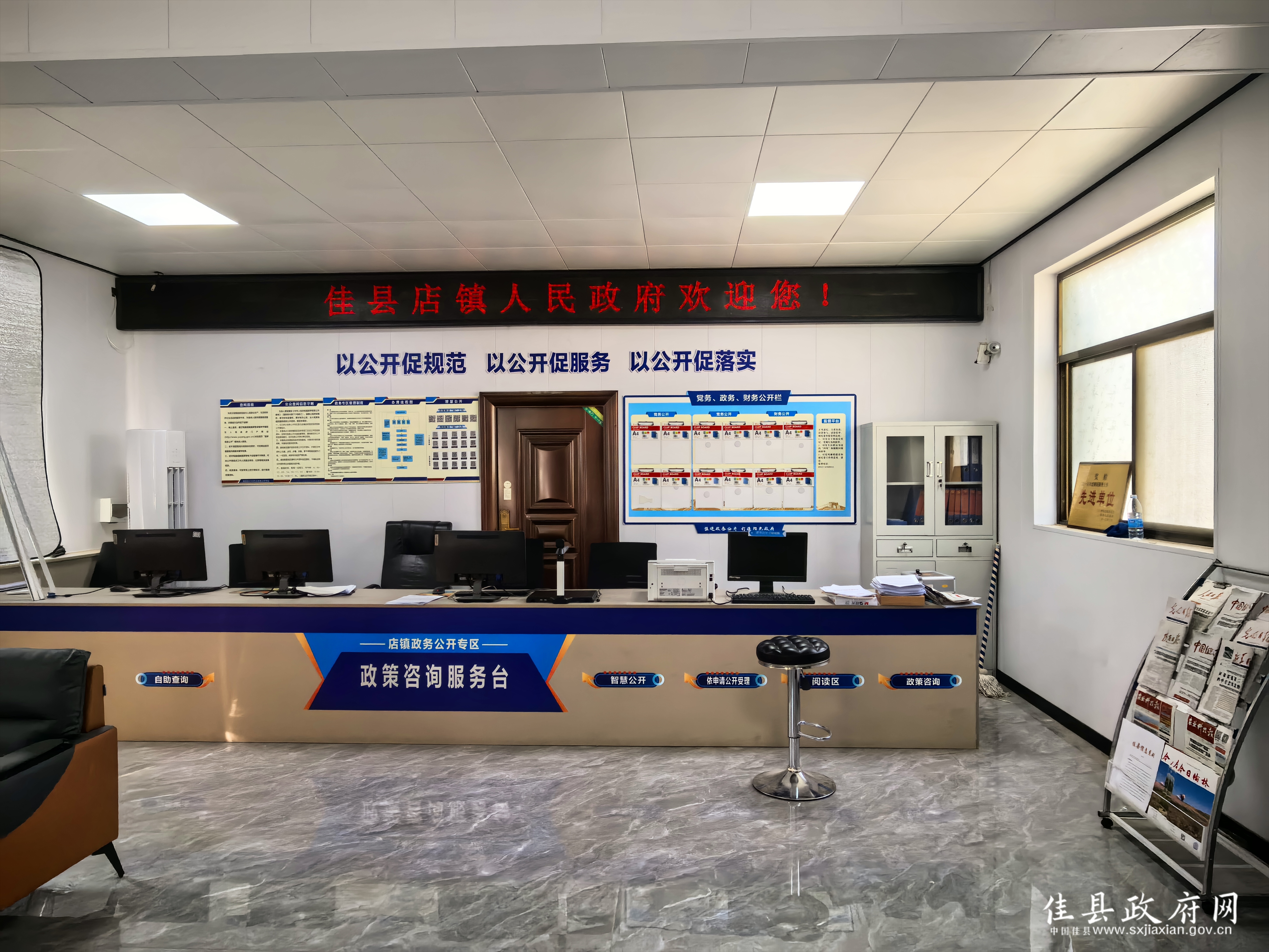 二、精细准备,夯实基础强保障。为确保专区建设标准统一、资源集约、服务高效,一是我县依据《佳县人民政府办公室关于印发基层政务公开专区建设标准的通知》,统一视觉设计,围绕“政务蓝”主基调,对专区标识标牌、制度展板、便民服务用品如鼠标垫、水杯等进行了统一设计定制,营造庄重、亲切、规范的政务公开环境。二是向县财政申请了政务公开专区建设专项经费,为实现“五统一”建设目标奠定了坚实的物质基础。