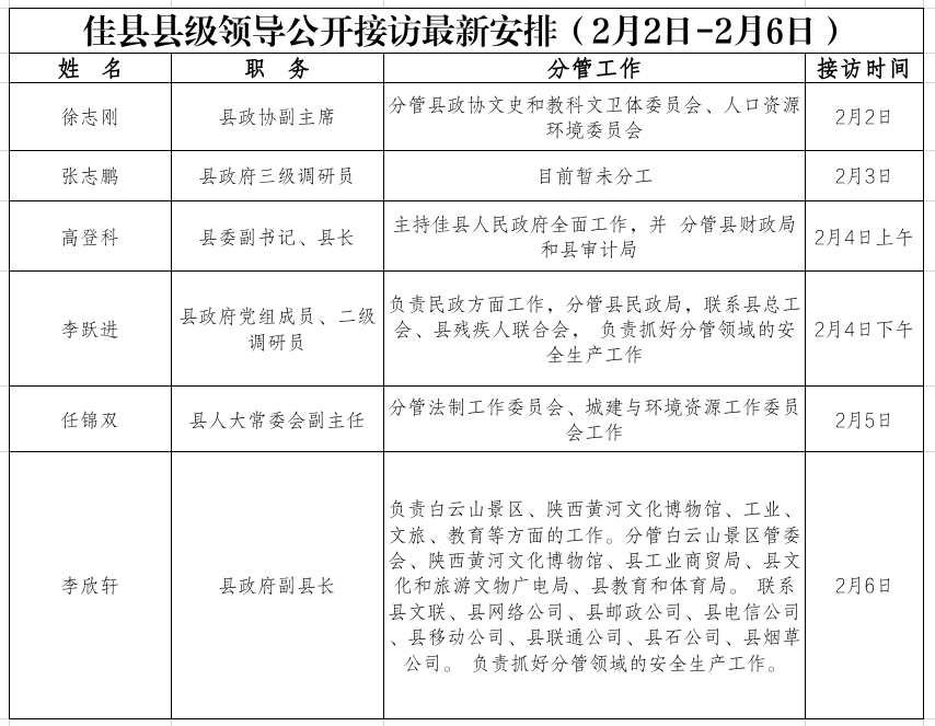 为进一步畅通信访渠道,方便群众及时就地反映诉求、解决问题,现将县级领导在佳县信访视频室公开接访安排计划公布如下: